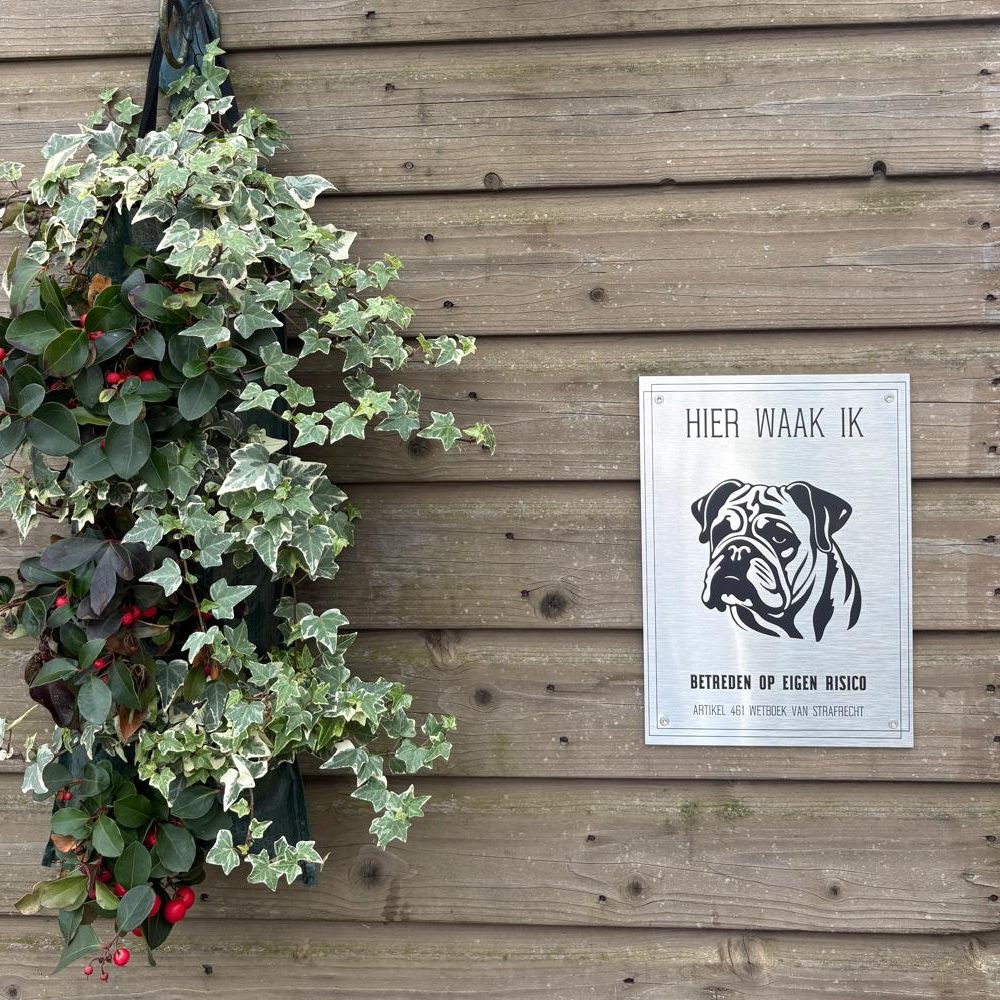 Het bord is vervaardigd uit duurzaam aluminium, waardoor het bestand is tegen alle weersomstandigheden zoals regen, wind en zonlicht. Hierdoor blijft de opdruk langdurig scherp en goed zichtbaar, zonder te vervagen. Dankzij het lichte maar robuuste materiaal is het bord eenvoudig te monteren op hekken, muren of poorten.
